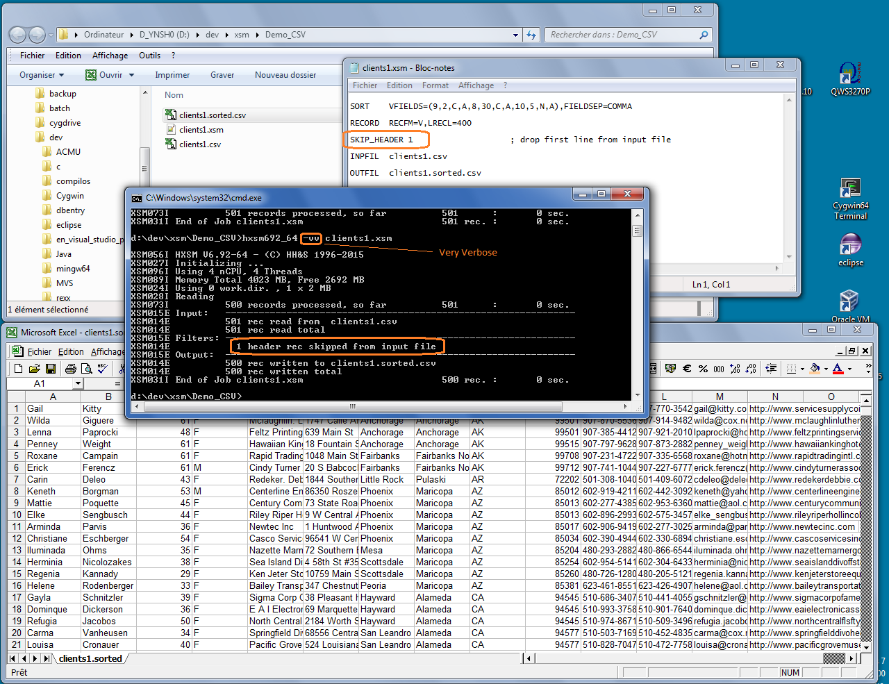 Step 4: Suppressing HeadersInput file contains 1 header line: We suppress it using SKIP_HEADER parameter.By the way, we now run XSM with --veryverbose or -vv option:XSM displays 501 input lines minus 1 header line, that gives 500 output lines. |